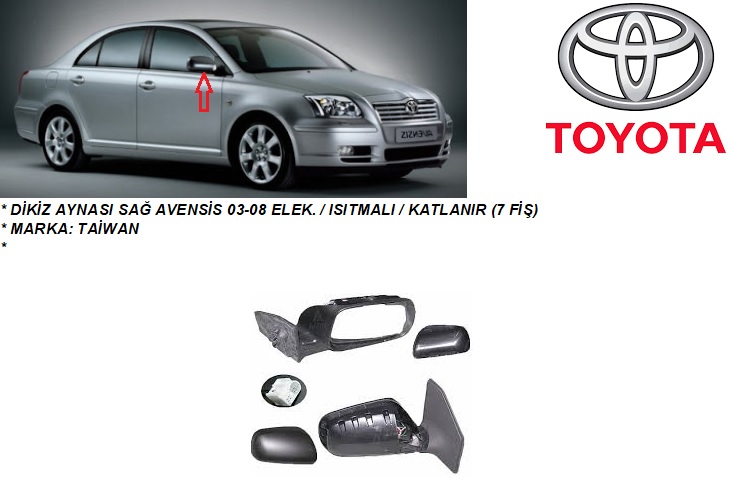 DİKİZ AYNASI SAĞ AVENSİS 03-08 ELEK. ISITMALI KATLANIR (7 FİŞ)