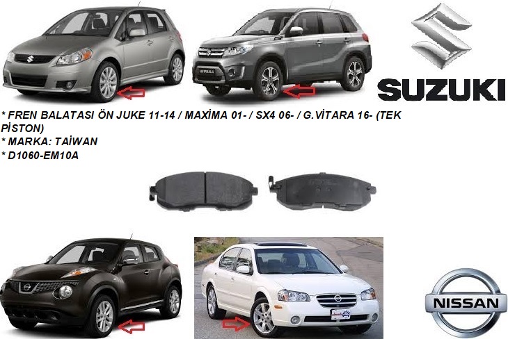 FREN BALATASI ÖN JUKE 11-14 MAXİMA 01- SX4 06- G.VİTARA 16- (TEK PİSTON)