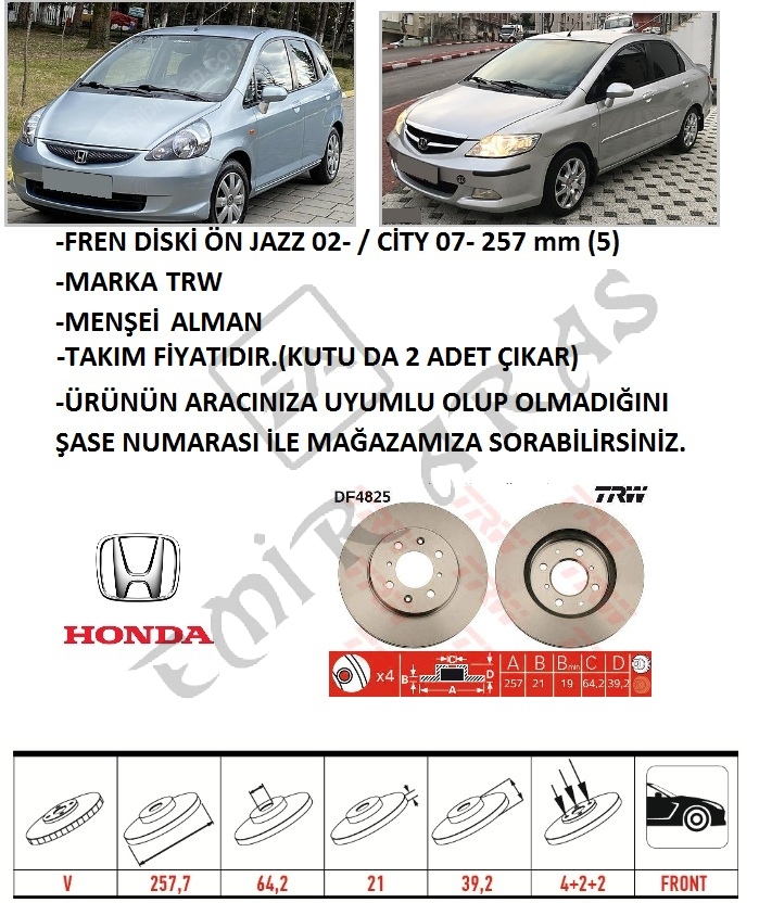 FREN DİSKİ ÖN JAZZ 02- CİTY 06-09 257 mm (4) SUNROFLU