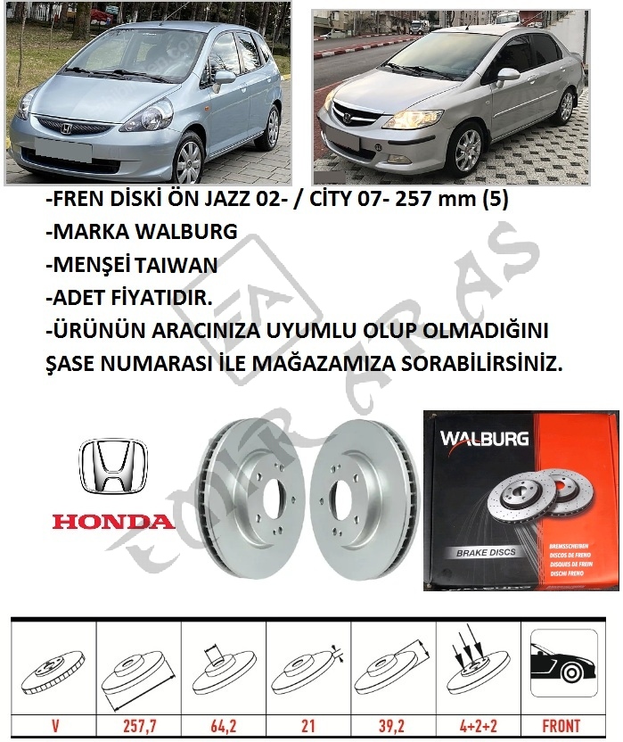 FREN DİSKİ ÖN JAZZ 02- CİTY 06-09 257 mm (4) SUNROFLU