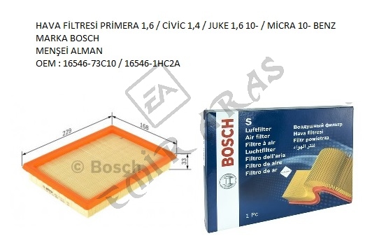 HAVA FİLTRESİ PRİMERA 1,6 CİVİC 96-00 1,4 JUKE 1,6 10- MİCRA 10- BENZ F026400222